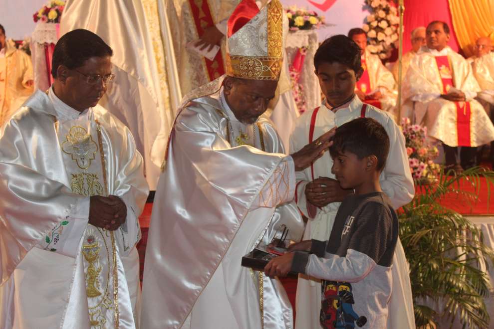 Rev. Fr. Saturino Almeida welcoming the Archbishop with a bowl of fruits.