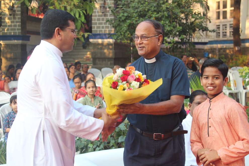 Rev. Fr. Saturino Almeida, welcoming Rev. Dr. Peter Machado Archbishop of Bangalore with a bouquet of flowers.