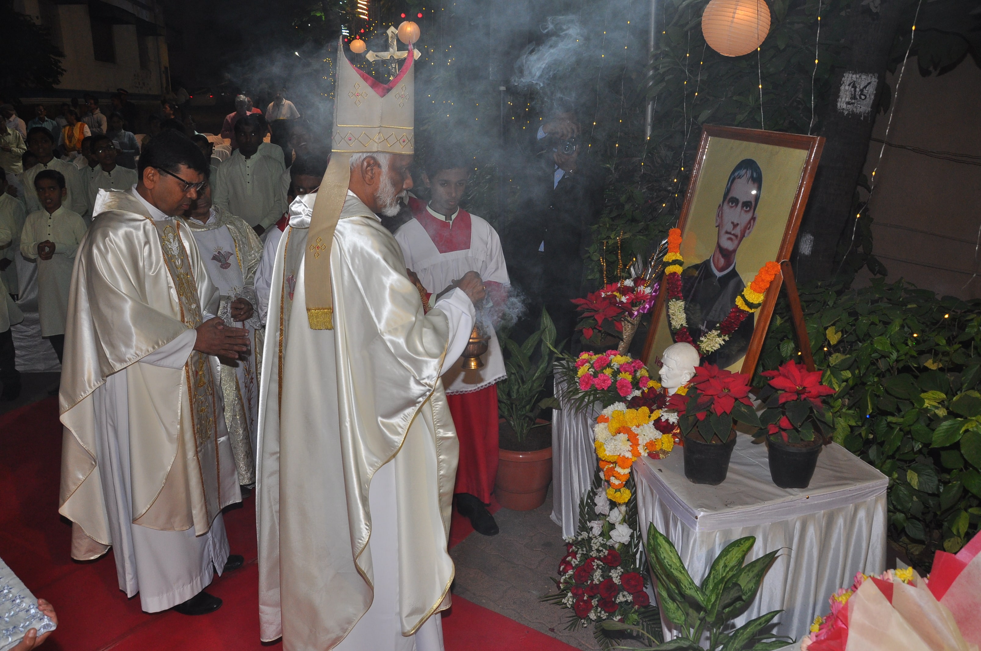 Most Rev. Lourdes Daniel and Rev. Fr. Valerian D'Souza, Superior of Fr. Agnel Ashram, Bandra, venerating the image of Ven. Fr. Agnelo D'Souza.